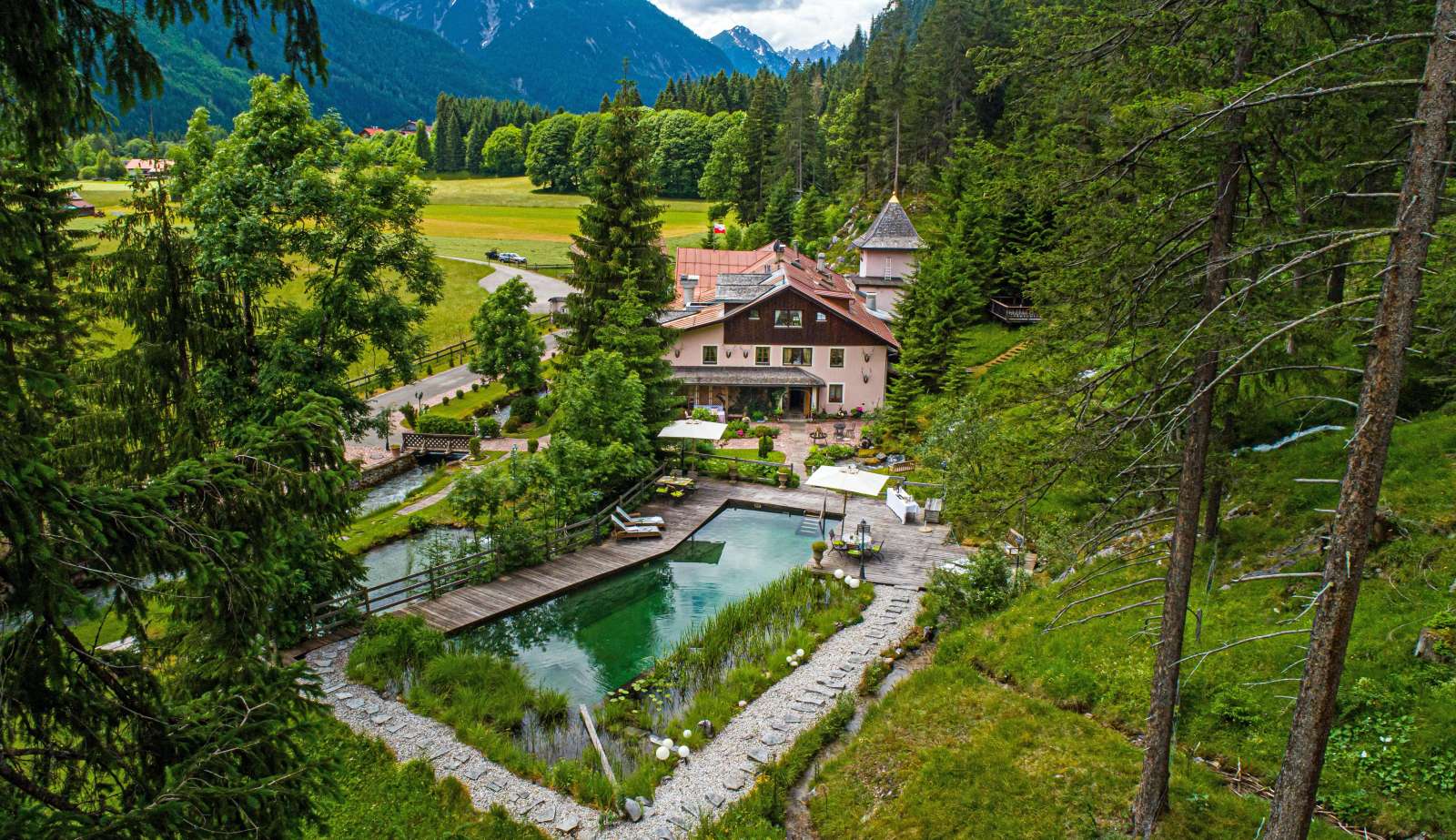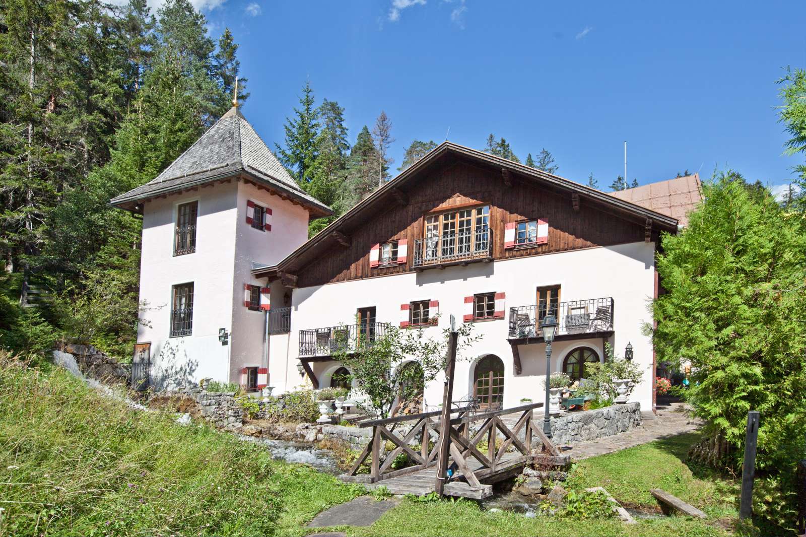 „Wo der Wildbach rauscht“ – so lässt sich das Gesamtensemble mit seiner rund 3.500 m² großen Gartenlandschaft, dem imposanten Haupthaus und seinen Außenanlagen treffend beschreiben. Das Wasser gehört von alters her zu diesem Anwesen; durchquert und umrahmt wird das Grundstück vom einstigen Mühlbach, dem Doserbach und von vier weiteren Wildbächen. Idyllische Ruheplätze sowie ein Schwimmbiotop mit großzügiger Sonnenterrasse, ein Forellenteich sowie urtümliche