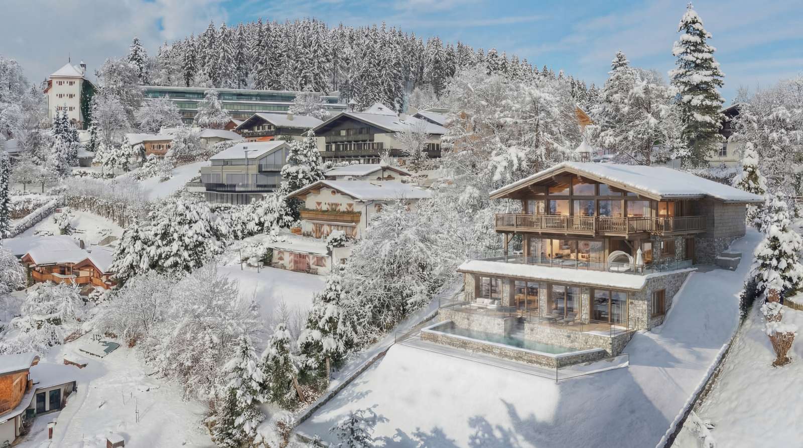 Das zum Kauf stehende, uneinsehbare, prachtvolle Grundstück liegt völlig diskret in einer Privatstraße und wird verwöhnt vom grandiosen Blick auf den gegenüberliegenden Hahnenkamm mit der weltberühmten Streif-Abfahrt und das lang gestreckte Tal in Richtung Süden. Ruhe und Sonne werden zum ständigen Begleiter. Die Nachbarschaft ist geprägt von großen Anwesen, höchste Privatsphäre ist hier selbstverständlich.