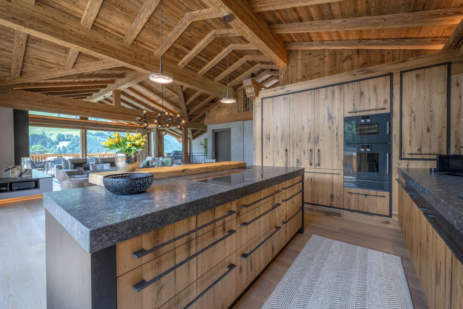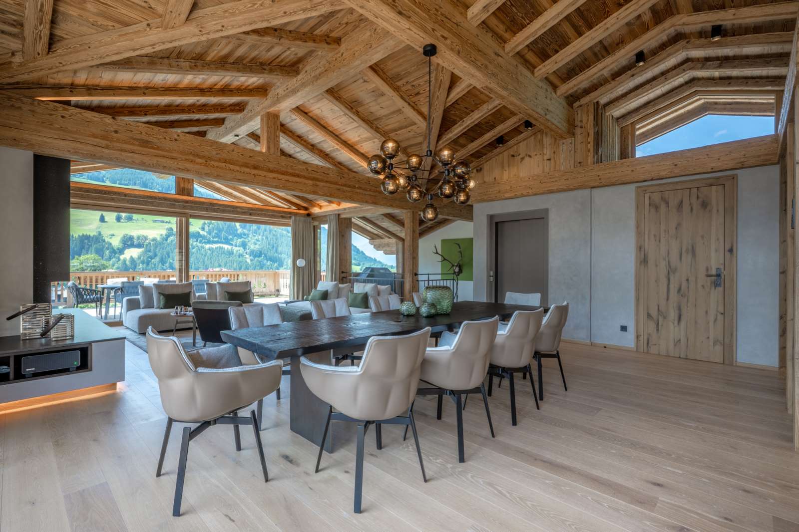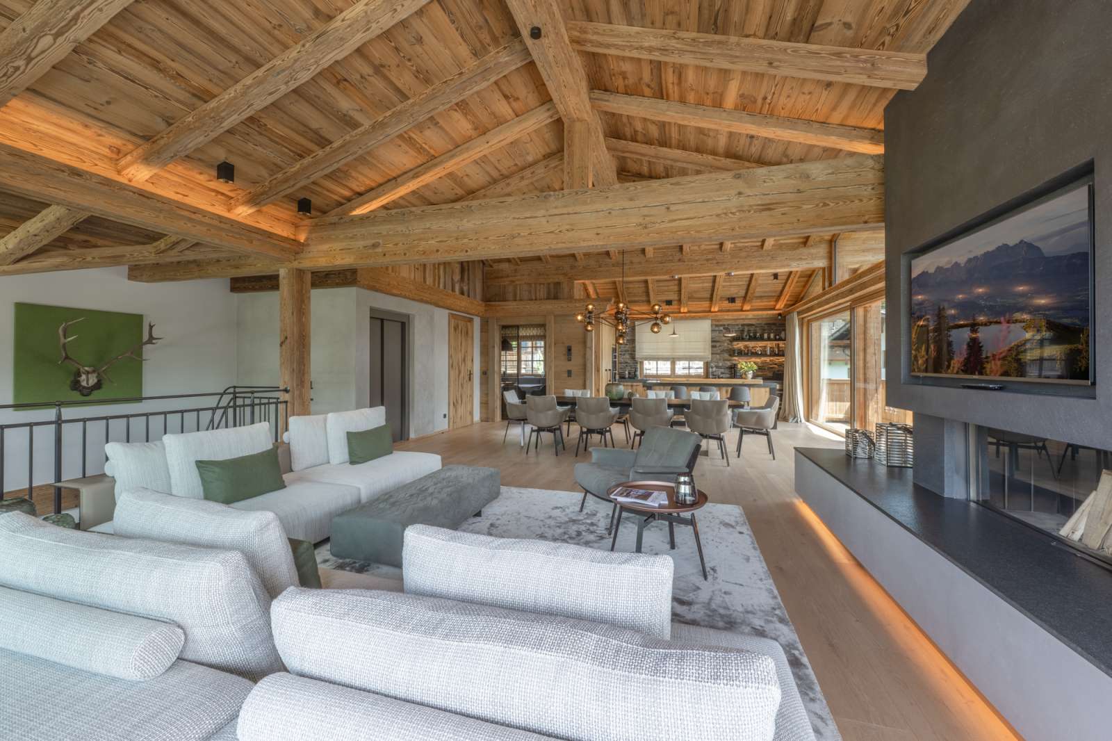 Im Obergeschoss empfängt ein äußerst großzügig und offen angelegter Wohn-Ess-Kochbereich mit prachtvollem Sichtgiebel aus Altholz, der als wertvolles Designelement miteinbezogen wurde und die Atmosphäre besonders heimelig macht. Die Küche ist umfassend ausgestattet und wird durch eine praktische Speis ergänzt, der zentrale Esstisch bietet Platz für eine große Familie, die extra Stube erinnert an die Tradition Tirols. Loungesofas laden vor dem Kamin zum Verweilen und Genießen ein. Die bodentiefe Verglasung zur breiten, überdachten Terrasse gibt die prachtvollen Ausblicke frei.