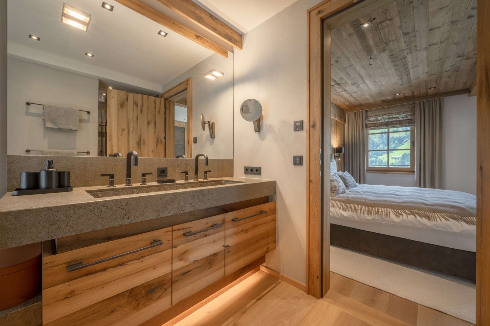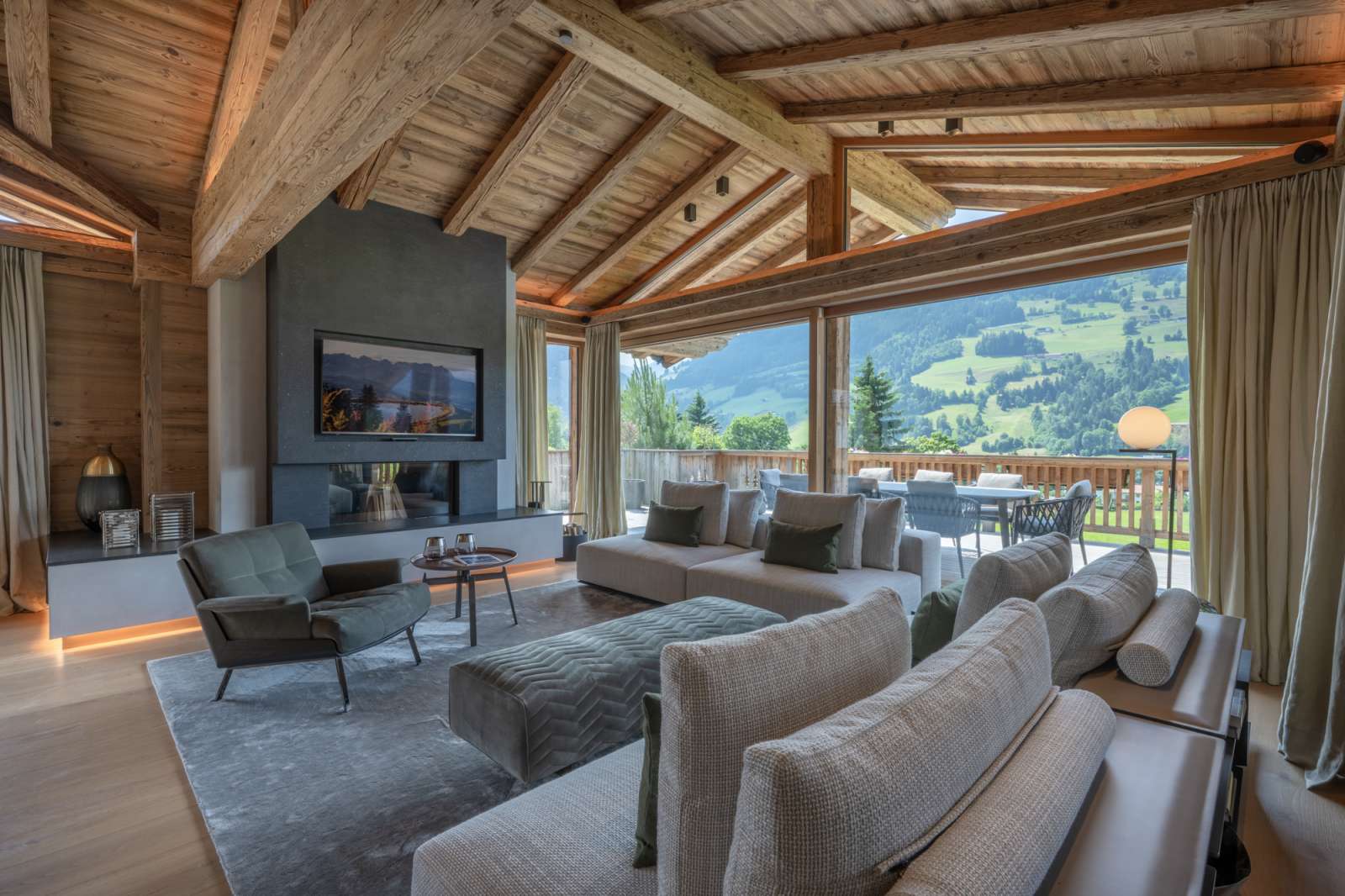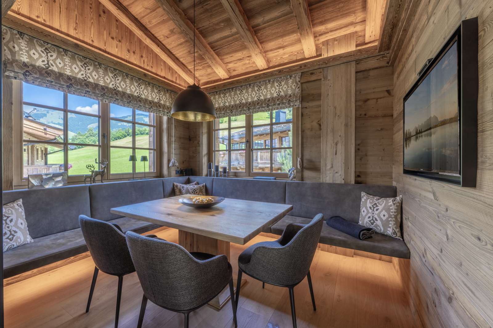 Im Obergeschoss empfängt ein äußerst großzügig und offen angelegter Wohn-Ess-Kochbereich mit prachtvollem Sichtgiebel aus Altholz, der als wertvolles Designelement miteinbezogen wurde und die Atmosphäre besonders heimelig macht. Die Küche ist umfassend ausgestattet und wird durch eine praktische Speis ergänzt, der zentrale Esstisch bietet Platz für eine große Familie, die extra Stube erinnert an die Tradition Tirols. Loungesofas laden vor dem Kamin zum Verweilen und Genießen ein. Die bodentiefe Verglasung zur breiten, überdachten Terrasse gibt die prachtvollen Ausblicke frei.