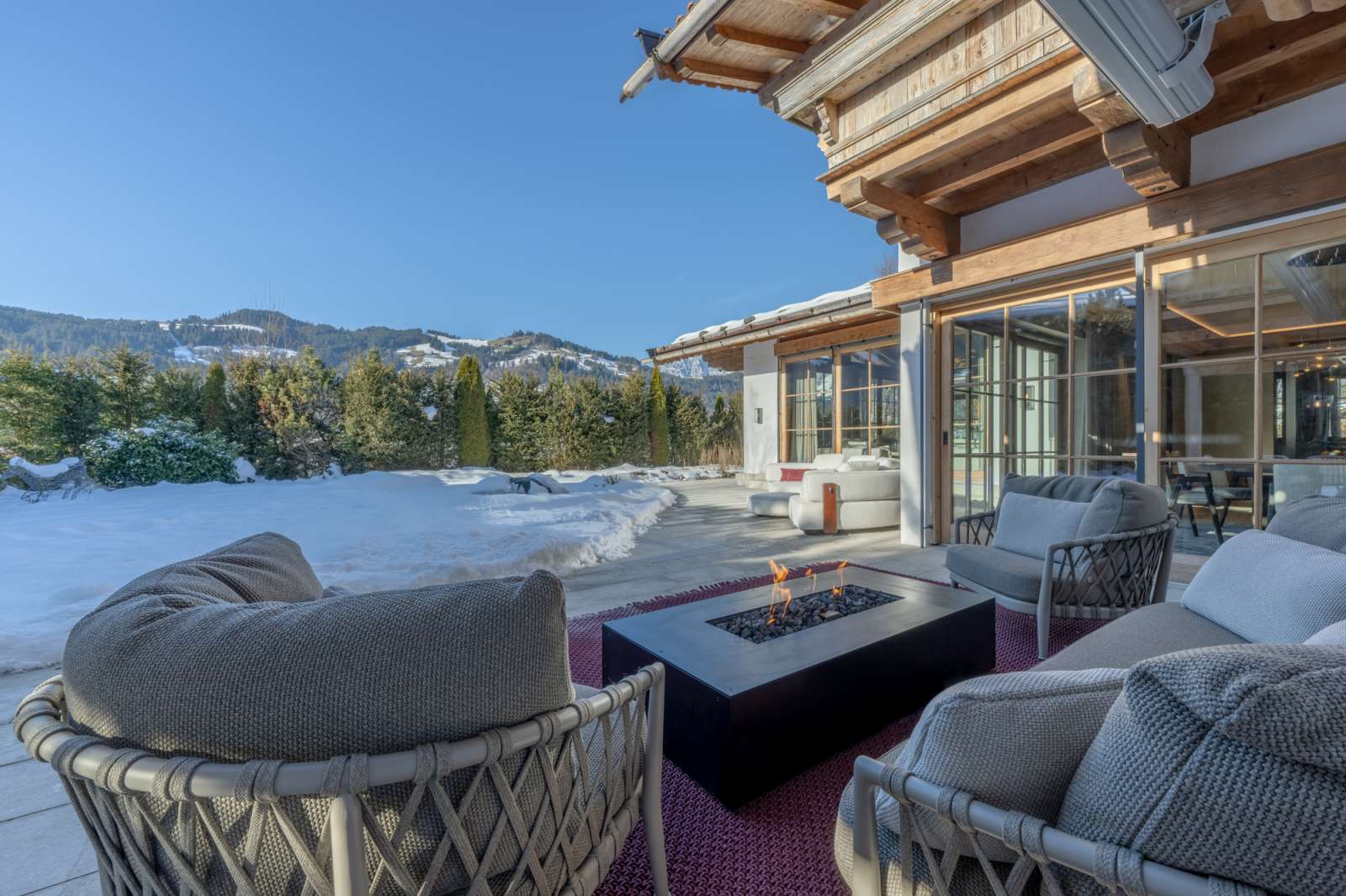Ein unvergleichliches Raumangebot erstreckt sich über drei Etagen, die auch mit einem Lift verbunden sind. Mit Feingefühl und höchsten Ansprüchen an Qualität wurde dem traditionellen Tiroler Stil eine elegante, zeitgenössische Interpretation eingehaucht. Erdige, warme Farben schaffen eine besonders gemütliche Atmosphäre, Akzente werden durch einen extravaganten Einrichtungsstil gesetzt. Der Landsitz steht eingebettet in einen bezaubernden Garten mit Seerosenteich, wird flankiert von großen Sonnenterrassen und einer überdachten Grill-Lounge. Das Massiv des Wilden Kaiser Gebirges mutet beinahe malerisch an und ist ständiger Begleiter.