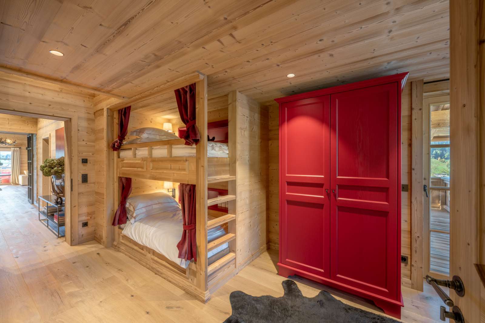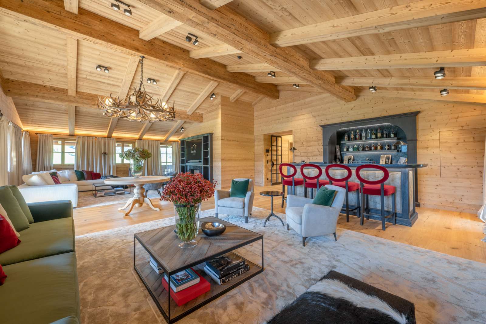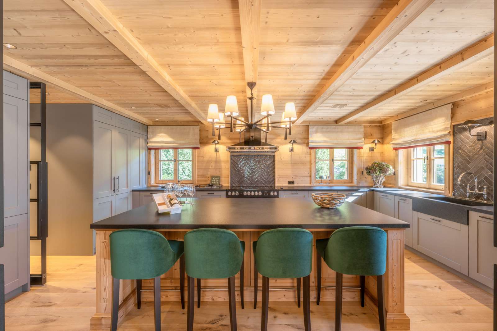Im Obergeschoss sind die nächsten drei Schlafzimmer jeweils mit eigenem Bad sowie einer großen Ankleide im Masterbereich. Ein weiteres Highlight ist der weitläufige Wohnraum mit gemütlicher Lounge samt offenem Kamin, einer Bar mit Paternoster-Lift in die darunter gelegene Küche, Sichtdachstuhl aus Altholz und vorgelagertem Balkon, der drei Seiten des Hauses flankiert.