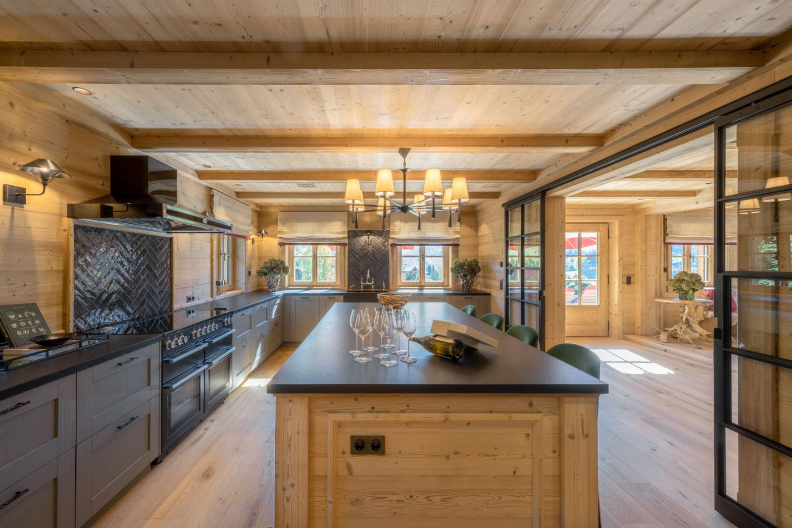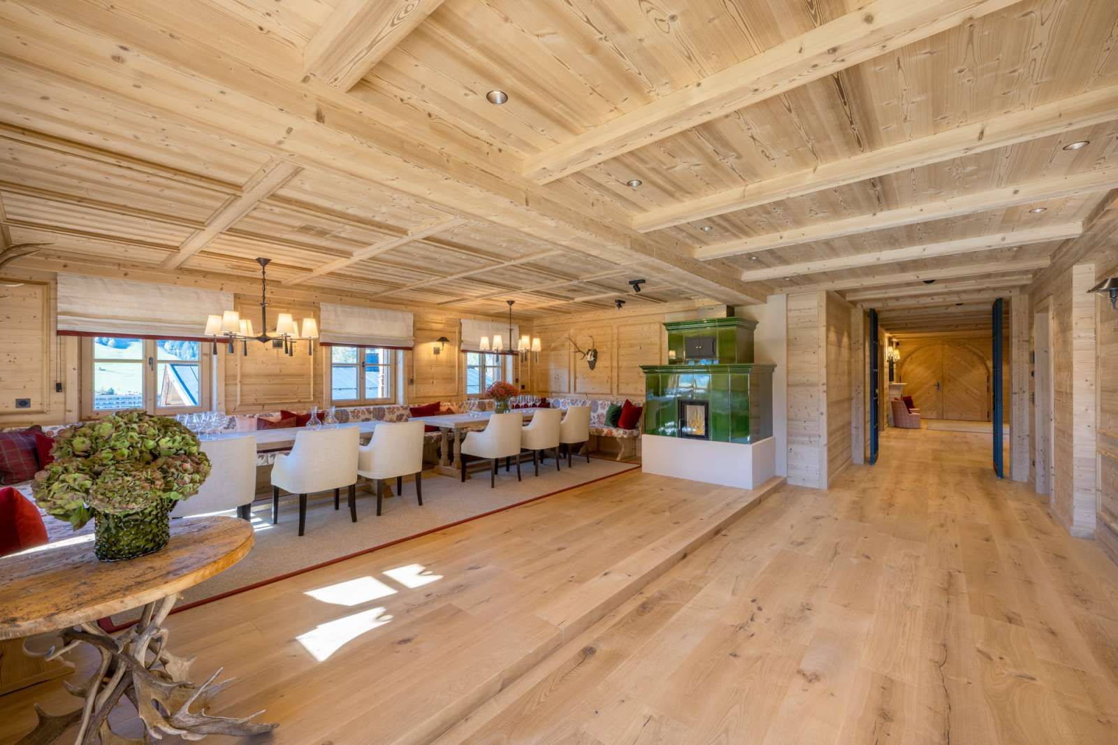 Das Entrée empfängt bereits im besonderen Stil, der für den Innenausbau gewählt wurde. Edle Materialien und helles Holz, das an Blickpunkten mit dezenter Schnitzerei an den ursprünglichen Charakter derartiger Bauernhäuser erinnert, ziehen sich wie ein roter Faden durch alle Bereiche. Man spürt das maßgefertigte Handwerk heimischer Betriebe ergänzt mit internationalem Design. Vorbei an Garderobe und Gästetoilette lädt die überaus große Stube mit dem typischen Bauernofen zum Verweilen ein. Raffiniert durchdacht kann die anschließende, perfekt ausgestattete Küche integriert werden oder mittels Schiebetüren auch abgetrennt - ein zweiter Zugang wurde über die Vorbereitungsküche mit Speis geschaffen. Breite Sonnenterrassen, ein talwärts gerichteter Balkon und der üppig angelegte, für die Gegend typische Garten umrahmen diese Etage, die durch zwei von insgesamt fünf Schlafzimmern mit Bädern en Suite komplettiert wird.
