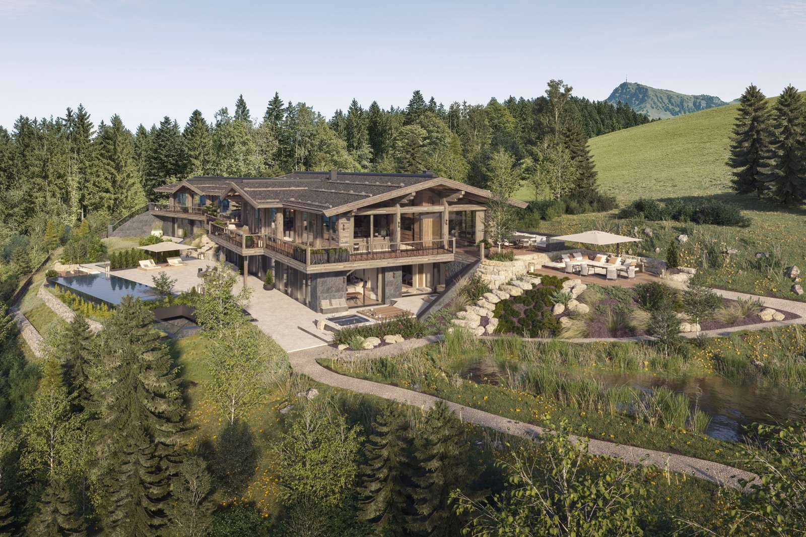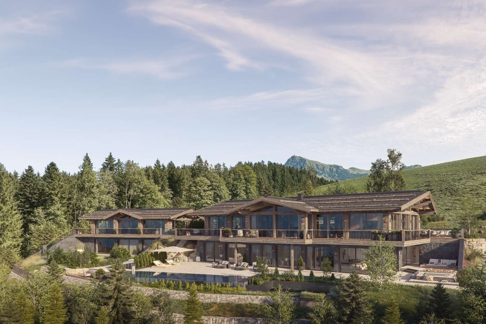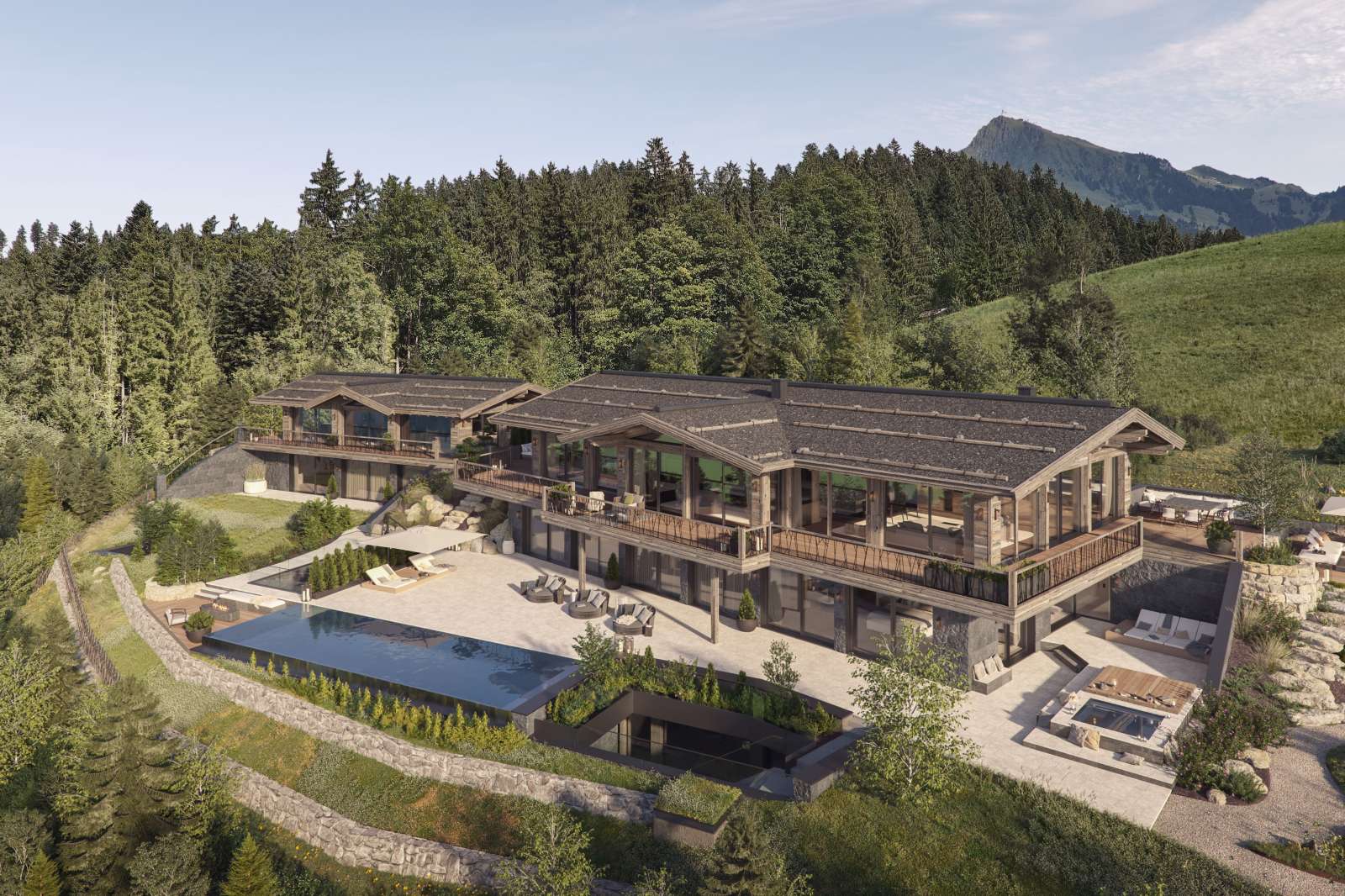 Das Anwesen steht am Ende einer privaten Zufahrtsstraße und ist derzeit im Bau befindlich. Unübertroffen in Exklusivität und Größe, einer architektonischen Symbiose aus Tradition und Moderne, der Qualität der Materialien und der Liebe zum Detail in der Ausstattung, wird das Anwesen seinen zukünftigen Besitzern ein einzigartiges Wohnerlebnis in den Bergen bieten. Geschützt durch einen kleinen Wald im Norden ist es von morgens bis abends sonnendurchflutet.