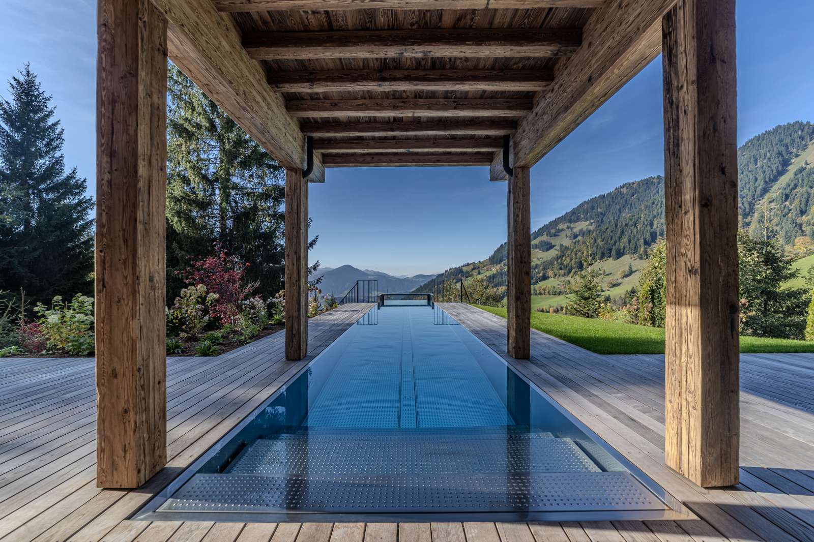 Das Erdgeschoss wurde als Schlafebene ausgebaut und bietet bequem insgesamt vier Schlafzimmern jeweils mit en suite Bädern Platz, im Masterbereich gibt es extra eine Ankleide. Bei mehr Bedarf wäre auch das Gym als Schlafzimmer ideal nutzbar, da ein Bad bereits vorhanden ist. Für Entspannung in den eigenen vier Wänden sorgt der feudale Wellnessbereich mit Sauna, Dampfbad und Relaxzone, wobei der ca. 15 Meter lange, teils verglaste Infinity-Pool im Freien ein wohl einzigartiges Schwimmvergnügen beschert, umrahmt von purer Natur und mit Blick in die Kitzbüheler Alpen.