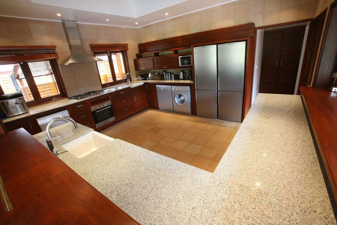 The villa has 450 sqm, 4 bedrooms with bathrooms and outdoor showers-luxury outfitted., a dining room, a living room with TV and a complete home entertainment system. Internet is available. There is a big kitchen with 2 new fridges, 2 new freezers, electric kitchen stove, gas stove, oven, new dishwasher, new washing machine and dryer, microwave and ice-machine. The kitchen is fully equipped. There is also a BBQ for use on the terrace or in the garden.