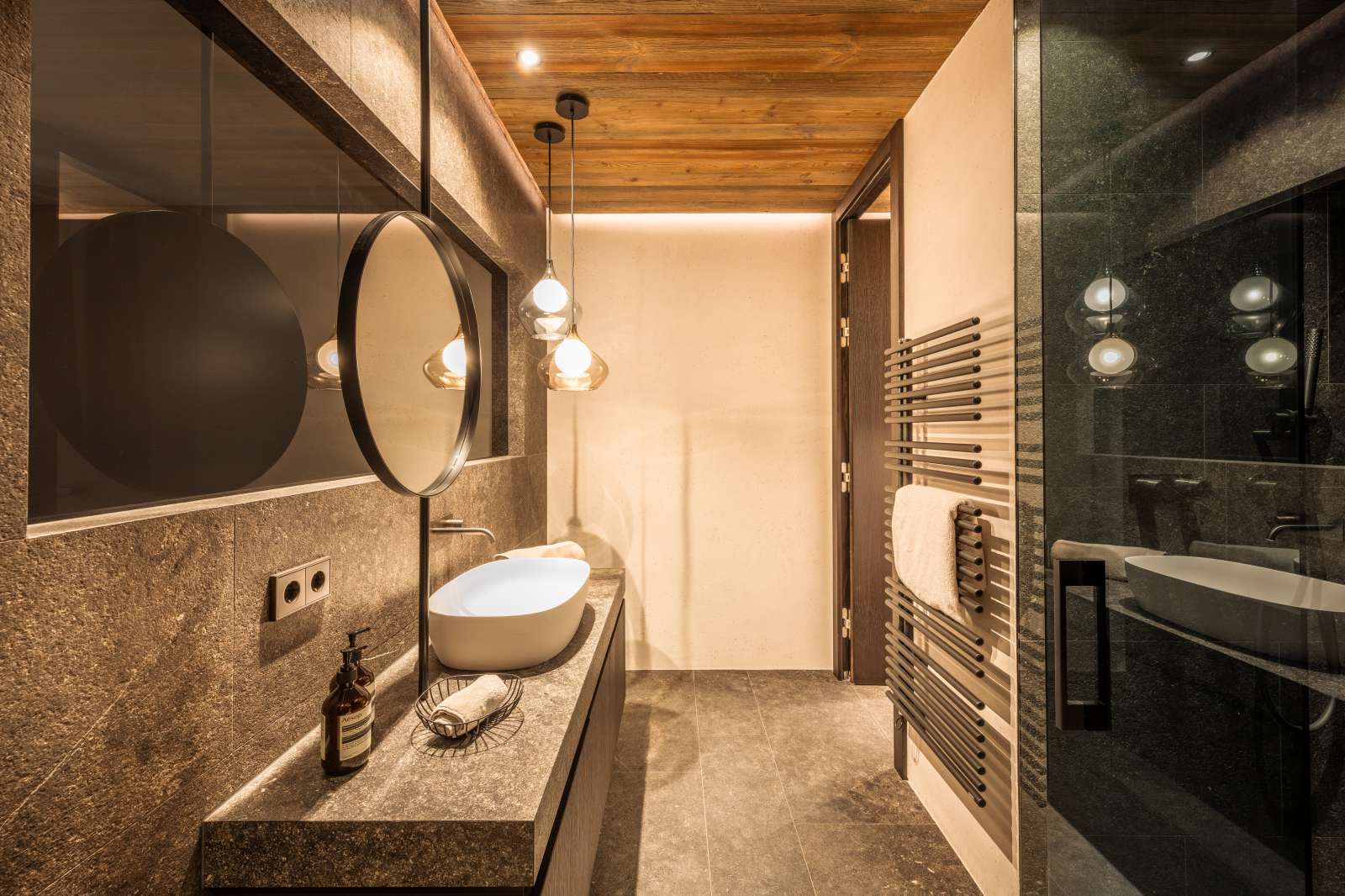 Aufwändige Tiroler Architektur, traditionelle natürliche Materialien und Privatsphäre prägen die 5 Lodges in dieser fantastischen Sonnenlage. Mit dem Anspruch an Perfektion bis ins kleinste Detail und im Einklang mit der Natur hat man geniale Raumkonzepte erschaffen. Möbliert wurde mit italienischen Designermöbeln von Minotti, Flexform und Poltrona Frau, einer maßgefertigten Küche von ST-ONE Design samt Geräten von Gaggenau & Bora. Es wurde bei der Auswahl der Materialen großer Wert auf höchste Qualität und Nachhaltigkeit gelegt. Verschiedene Arten von Loden, Leder und Leinen prägen die Innenraumgestaltung, die Skyframe Minimal Fenster sorgen für maximalen Blick, für die Aussenanlagen wurden lokale Rohstoffe wie Holz und Naturstein verarbeitet.