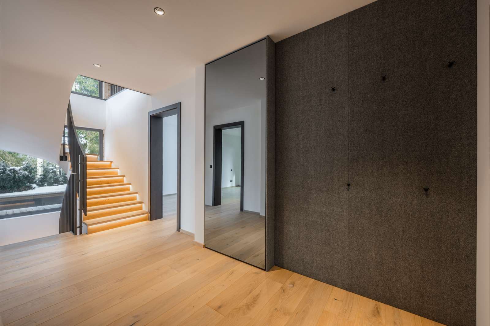 Im Erdgeschoss sind jeweils die Eingangsbereiche mit Diele, Garderobe und Gästetoilette, weiters zwei Schlafzimmer mit Bad en Suite.