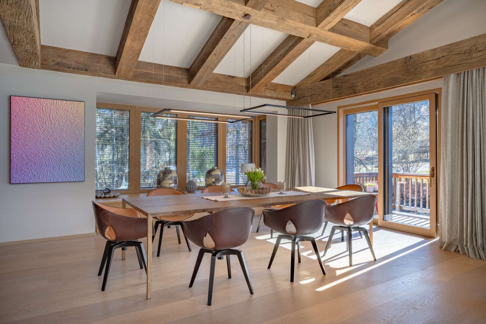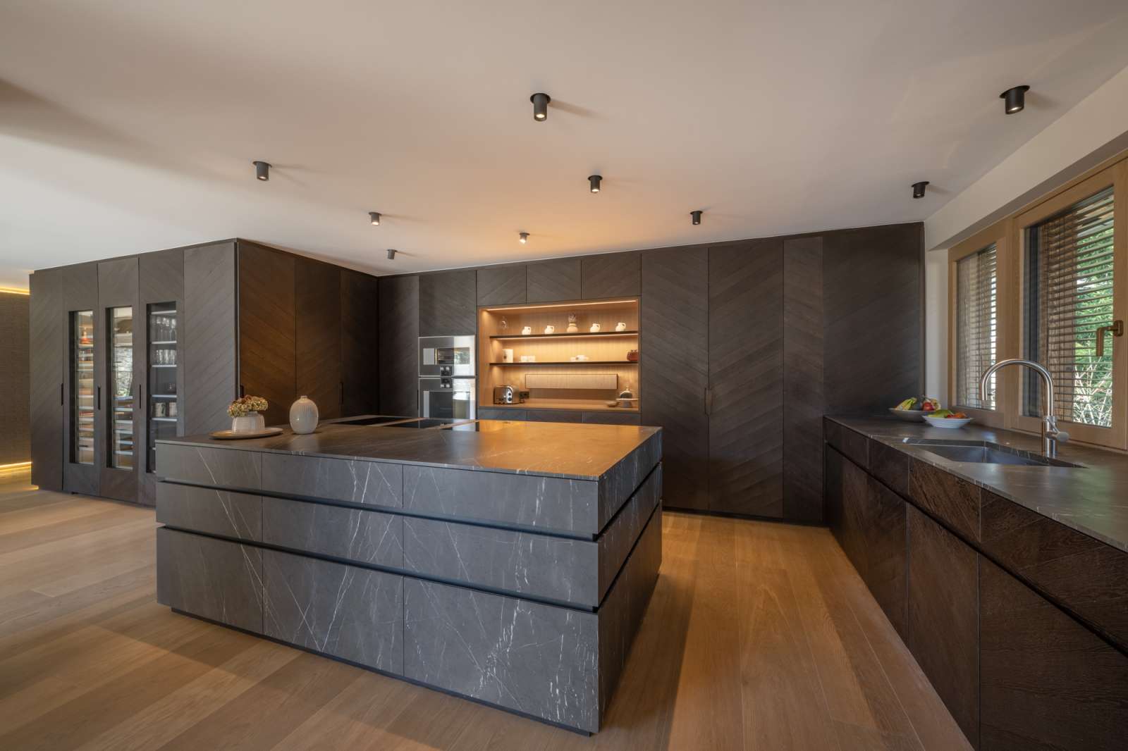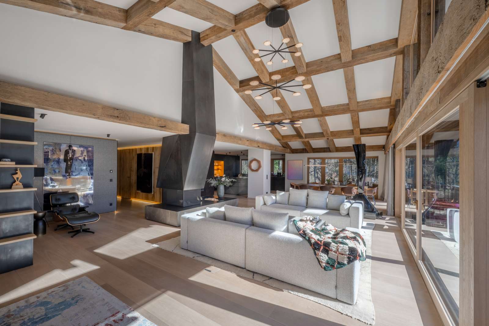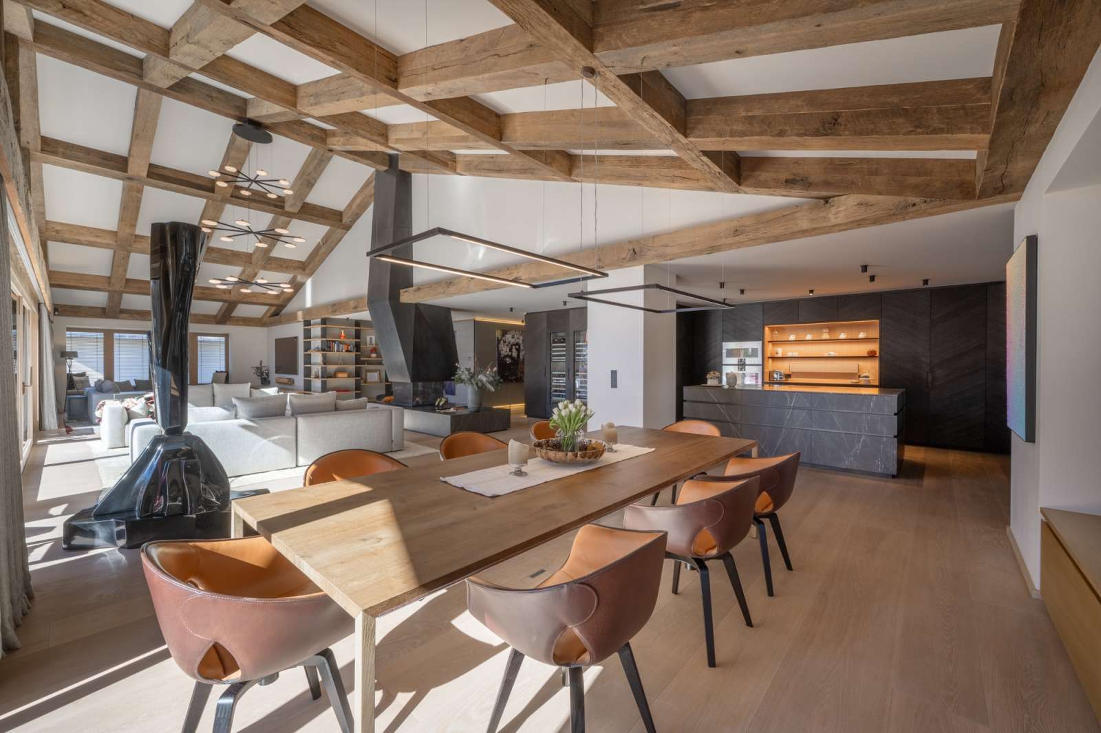 Der loftartige Wohnraum besticht nicht nur durch seine Größe mit ca. 158 qm, sondern auch durch eine außergewöhnliche Raumhöhe von bis zu ca. 6 Metern und eine bodentiefe Panoramaverglasung, die im Einklang mit der Natur leben lässt. Die perfekt ausgestattete Küche geht fließend in den Essbereich über, gemütliche Sofas flankieren den Kamin mit anschließender TV-Lounge. Vorgelagert laden breite Terrassen zum Genießen im Freien ein. Heizstrahler sorgen auch an kühlen Abenden für wohlige Wärme. Auch auf dieser Ebene befinden sich die ersten beiden von insgesamt vier Schlafzimmern. Die Eigner-Schlafsuite bietet ein Wellness-Bad mit privater Sauna und eine große Ankleide - eine Gästetoilette sowie der Hauswirtschaftsraum komplettiert diese Ebene.