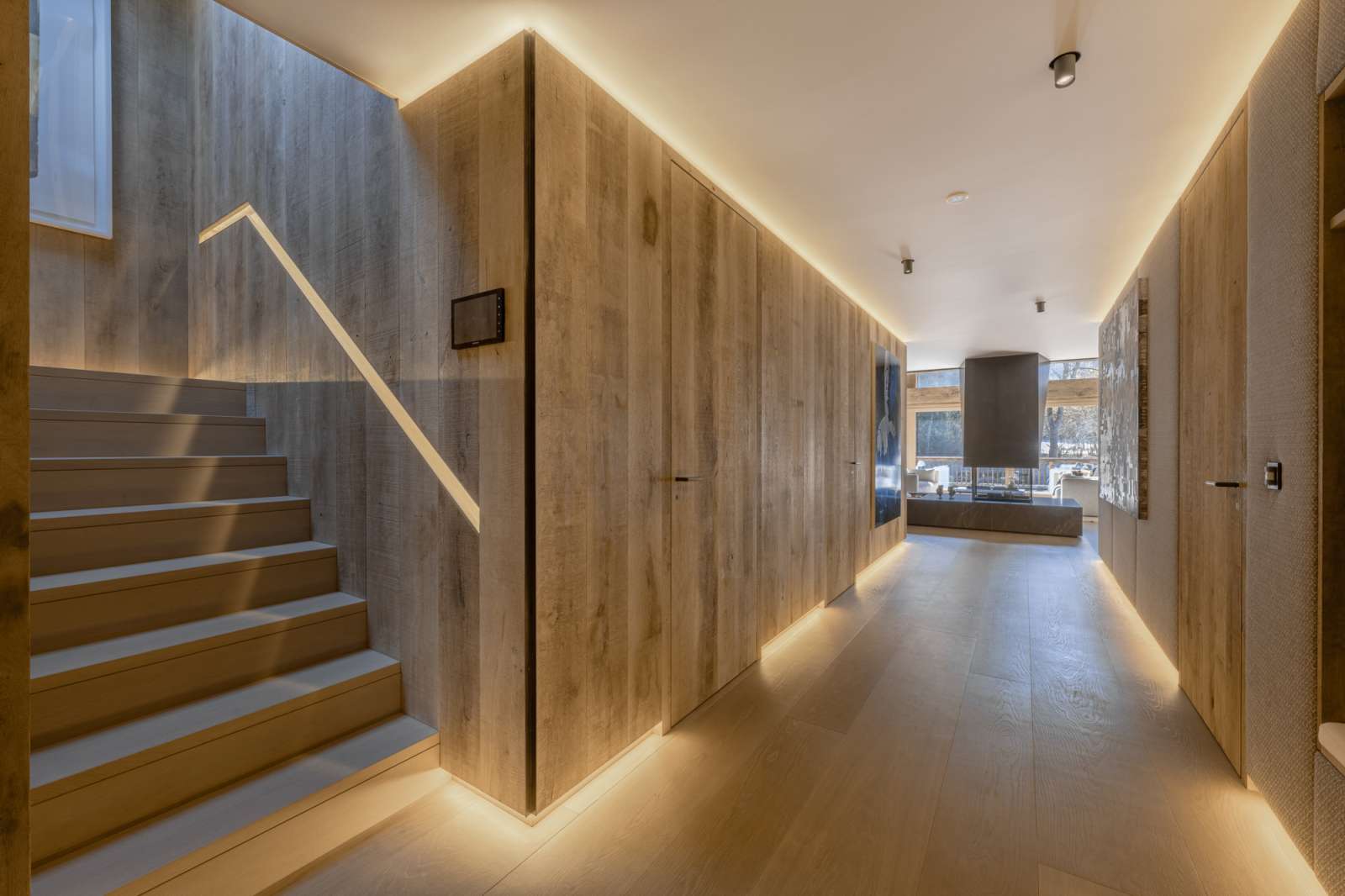 Beim Betreten des Penthouses öffnet sich eine schier endlose Blickachse über die Diele mit Garderobe hinweg zum freistehenden, offenen Kamin im Wohnzimmer - die Architektur ist beeindruckend.